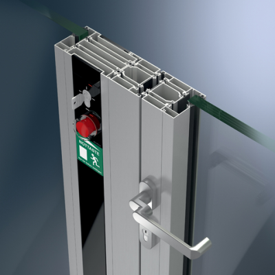 Schüco offers an attractively designed integrated emergency door lock in close proximity to the emergency fitting to allow fast and secure exit from rooms in an emergency. Presence of an emergency button integrated in the profile, very close to the antipanic fittings.