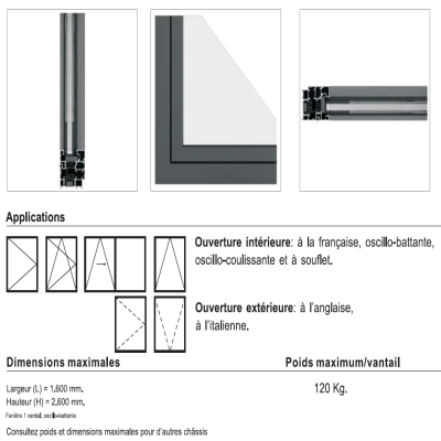 Ouverture intérieureÀ la française, oscillo-battante, pliable, oscillo-coulissante et à souflet.
