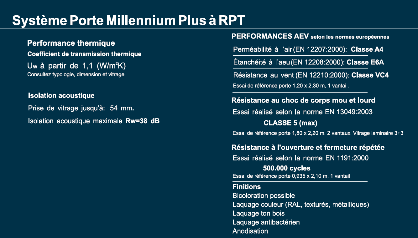 Son bas coefficient de transmission thermique à partir de 0.9 W/m²K uni à sa prise de vitrage de 54 mm, lui confèrent des maximaux performances thermiques et acoustiques.