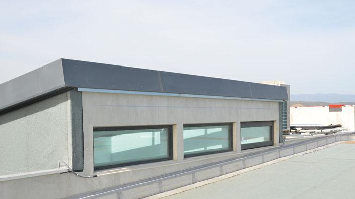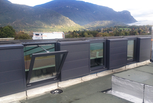 Smoke removal window PETA.ECOVISION EL, certified according to NF EN 12101-2, aluminium frames with or without thermal bridge rupture, colour finishing in natural anodized or RAL colour, glass glazing 44.2/16/44.2 (or other), 24V actuator for open/close functions.