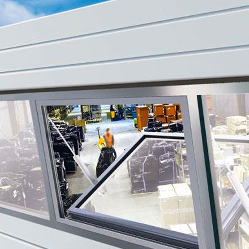 The windows are equipped with two pneumatic actuators with 40mm diameter (1,57 in). The actuators come in pairs and are installed on the sides of the mobile frame, through a fixation console lacquered at the same RAL as the window. The copper tubing and respective accessories as well as the compressed air system are very discreet.