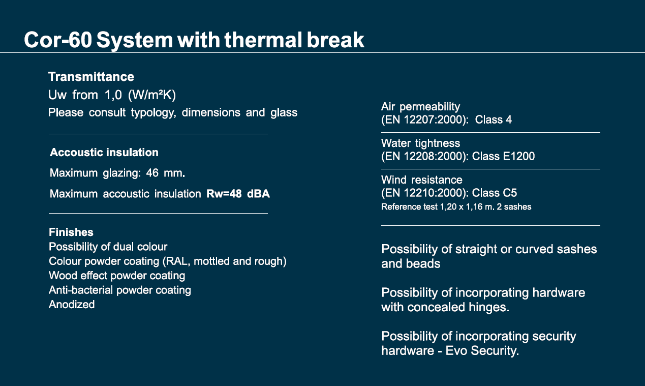 CORTIZO differentiates itself by internally completing the integral cycle of the production of its windows and doors, from the manufacture of the profiles to all the components necessary for the elaboration thereof, namely, fittings, polyamides and water tightness gaskets. Ensures rigor in each procedure and the quality of the methods and materials employed throughout all of the process. With the new tilt and turn system with 60mm, with thermal break, Cortizo ensures the requirements for design, thermal and acoustic insulation.