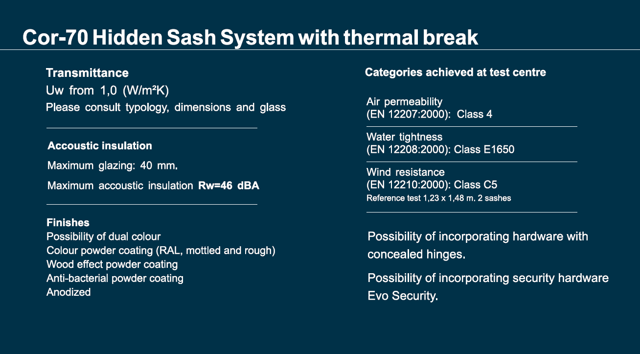 A 35 mm thermally broken area and the insertion of polyolefin sponge in the frame and sash allows it to reach values of up to 1,0 W/m²K of transmission in the space and therefore maximising its energy efficiency.