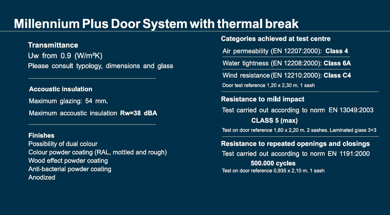 With a frame transmission value from 0.9 W/m²K, it reaches unbeatable thermal features and its great glazing capacity guarantees a máximum accoustic insulation.
