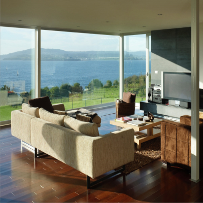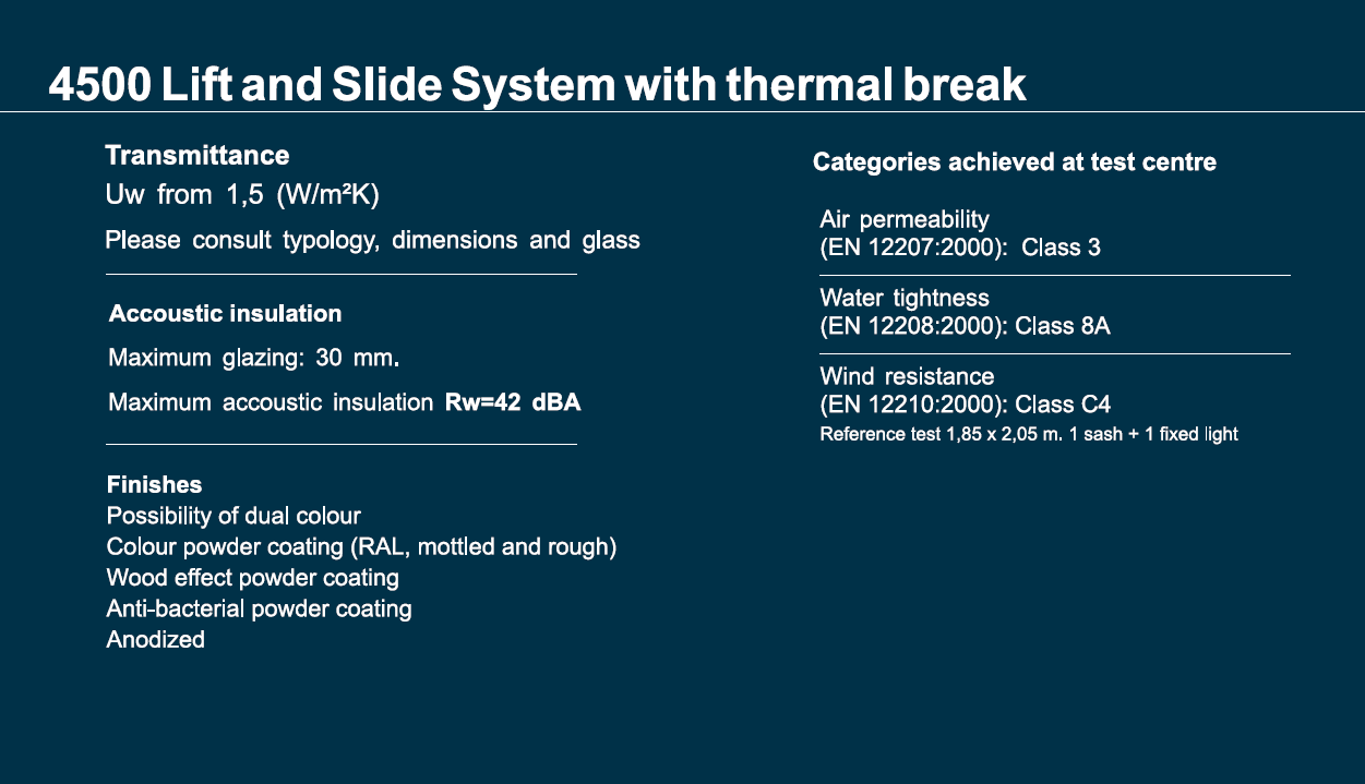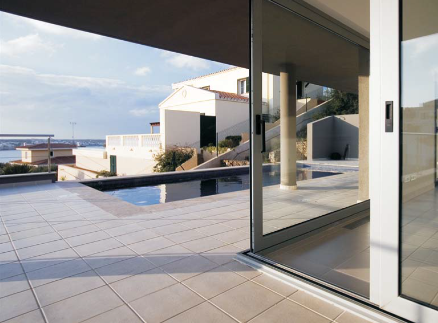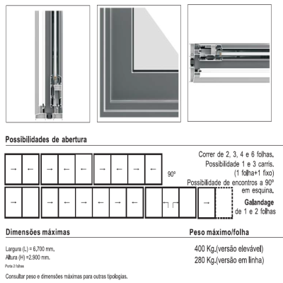 A perimetral sliding door system with thermal breaking and a bevelled or curved style both in sashes and beads.