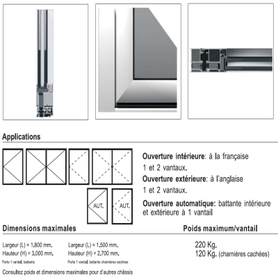 Possibilidade de dobradiças ocultas para dimensões e pesos máximos por folha de 2.700 mm. de altura, 1.500 mm. de largura e 120Kg. e com abertura máxima de 100°.