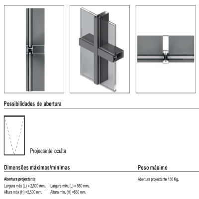 A ampla gama destes perfis e de uniões mecânicas dos mesmos, permite a execução de todo tipo de fachadas (na vertical, com inclinação, em esquina a 90º ou poligonais), assim como a resolução de modelações com vidros de grandes dimensões e peso.